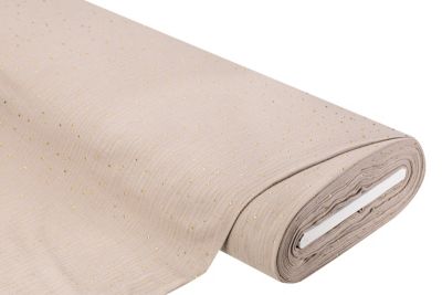Musselin/Doppel-Gaze mit Glitzerdruck "Tupfen", Farbe: taupe/gold, Tupfengrösse: 2–3 mm Ø, Breite: 135 cm, Gewicht: ca. 120 g/m². Material: 100 % Baumwolle.