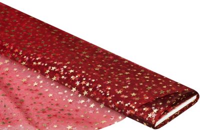 Hauchfeiner Organza "Sterne" mit Foliendruck, transparent, Farbe: rot, Motivgrösse Sterne: 5 – 10 mm Ø, Breite: 145 cm, Gewicht: ca. 25 g/m². Material: 50 % Polyamid, 50 % Polyester.
