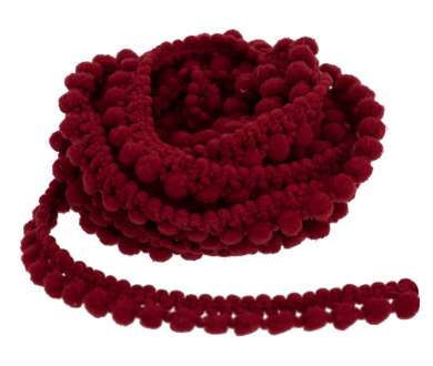 Pompon-Borte, Farbe: bordeaux, Gesamtbreite: 8 mm, Pompon: 5 mm Ø, 5 m pro Rolle. Material: 100 % Polyacryl.