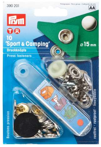 Prym Nähfrei-Durckknöpfe "Sport & Camping". Farbe: silber, Grösse: 15 mm Ø, Material: Messing, Inhalt: 10 Stück, inkl. Verarbeitungswerkzeug aus Kunststoff und Metall und Arbeitsanleitung.