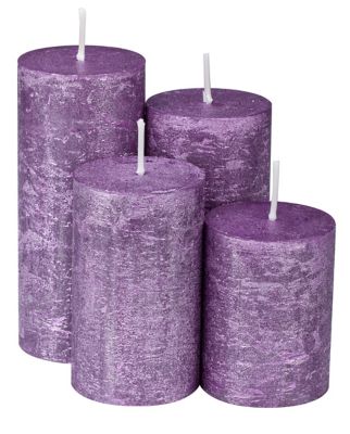 Rustikale Kerzen, abgestuft, Farbe: lila-metallic, Grössen: 8 cm, 10 cm, 12 cm und 14 cm hoch, 6 cm Ø, Inhalt: 4 Stück.