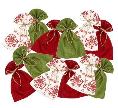 Säckchen aus Baumwolle, Farben: rot, grün und weiss, Grösse: 15 x 20 cm, Inhalt: je Farbe 4 Stück = 12 Stück. Material: weiss: 80 % Polyester, 20 % Baumwolle, rot und grün: 100 % Baumwolle.