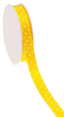 Satin-Tupfenband, Farbe: gelb, Breite: 15 mm, 10 m pro Rolle. Material: 100 % Polyester.