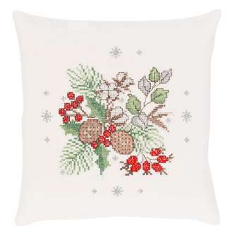 Stickkissen "Beeren & Zapfen", zum Besticken in Kreuz- und Steppstich. Vorgedrucktes Motiv, fertig genäht, mit Rückseite und Reissverschluss. Ohne Kissenfüllung. Komplettpackung: Anleitung, Garn, Sticknadel. Stofffarbe: elfenbein. Grösse: 40 x 40 cm. Material: Stoff 50 % Baumwolle, 50 % Leinen, Garn 100 % Baumwolle.