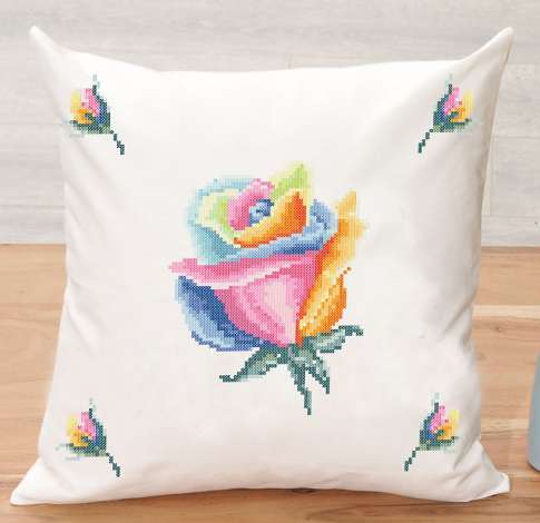 Stickkissen "Rose", zum Besticken in Kreuzstich. Vorgedrucktes Motiv, Kissen fertig genäht mit Kissenrücken und Reissverschluss. Ohne Kissenfüllung. Komplettpackung: Anleitung, Garn, Sticknadel. Stofffarbe: elfenbein. Grösse: 40 x 40 cm. Material: 50 % Baumwolle, 50 % Leinen, Garn 100 % Baumwolle.