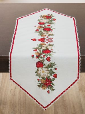 Stickläufer "Landhaus-Weihnacht", zum Besticken in Kreuz- und Knötchenstich. Vorgedrucktes Motiv, randfertig gesäumt mit rotem Spitzenband. Komplettpackung: Anleitung, Garn, Sticknadel. Stofffarbe: elfenbein. Grösse: 35 x 100 cm. Material: Stoff 50 % Leinen, 50 % Baumwolle, Garn 100 % Baumwolle.