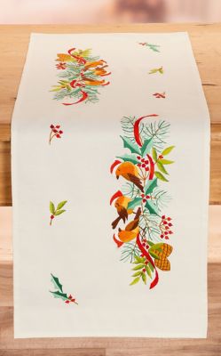 Stickläufer "Rotkehlchen mit Mütze", zum Besticken in Platt-, Stiel-, Knötchenstich und Nadelmalerei. Vorgedrucktes Motiv, randfertig gesäumt. Stofffarbe: elfenbein. Grösse: 35 x 95 cm. Material: Stoff und Garn 100 % Baumwolle.