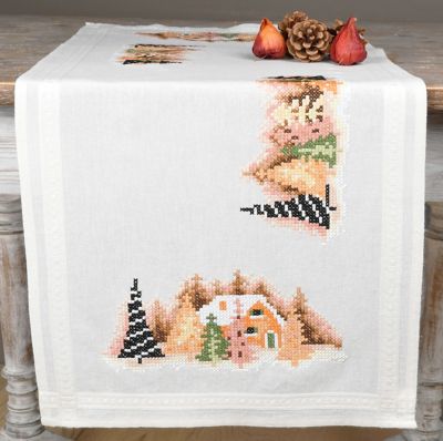 Stickläufer"Winterdorf modern", zum Besticken in Kreuzstich. Vorgedrucktes Motiv, mit Webrand, randfertig gesäumt. Komplettpackung: Anleitung, Garn, Sticknadel. Stofffarbe: ecru. Grösse: 40 x 100 cm. Material: Stoff und Garn 100 % Baumwolle.