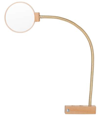 Sticklupe mit Befestigungsvorrichtung für den Stickrahmen B.-Nr. 99.447.73. Der biegsame Schwenkarm aus Messing lässt sich nach Belieben verstellen. Rahmen aus Buchenholz, Lupengrösse: 10 cm Ø, 2-fache Vergrösserung.