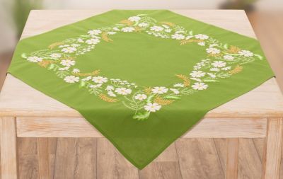 Stickmitteldecke "Blütenpracht", zum Besticken in Stiel-, Margeriten-, Plattstich und Nadelmalerei. Vorgedrucktes Motiv, randfertig gesäumt. Komplettpackung: Anleitung, Garn, Sticknadel. Stofffarbe: grün. Grösse: 72 x 72 cm. Material: Stoff und Garn 100 % Baumwolle.