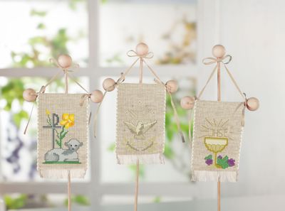 Stickpackung Osterfahnen "Ostersymbole", im 3er Set, zum Besticken in Kreuzstich. Komplettpackung: Anleitung, Zählvorlage, 3x Stoffzuschnitt Grösse: 10 x 13 cm zum Fertignähen, Inhalt: 6x Holzstäbe, 9x Holzkugeln für Endstücke, Satinband, Garn, Sticknadel. Stofffarbe: leinen. Material: Stoff und Garn 100 % Baumwolle (ca. 6 Stiche cm).