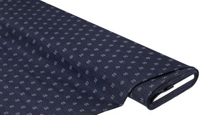 Stretch-Jacquard "Blümchen", Farbe: blau, längselastisch, Motivgrösse Blume gross: 1,5 cm Ø, Breite: 150 cm, Gewicht: ca. 220 g/m². Einlaufwert: ca. 15 % in der Länge. Material: 75 % Viskose, 22 % Polyamid, 3 % Elasthan.