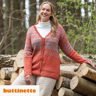 Strickanleitung – XL-Cardigan aus Woll Butt Primo Selma Tweed. Stimmungsmacher an trüben Herbsttagen: Der traumhafte Cardigan trumpft mit einem lebhaften Mix aus Glatt-Rechts-Struktur in schlichtem Uni und zweifarbigem Jacquardmuster auf. Er ist gerade geschnitten und hat einen V-Ausschnitt. Die angestrickten Blenden mit Knopfverschluss fügen sich harmonisch ins Gesamtbild ein – der perfekte Wohlfühl-Look.