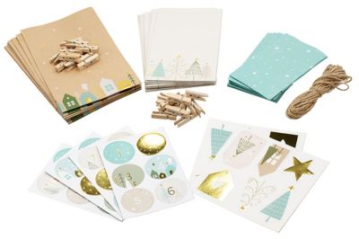 Ursus Adventskalender "Sweet Home", Inhalt: 8 Tüten braun 12 x 6 x 21 cm, 8 Tüten weiss 10 x 5,5 x 17,5 cm, 8 Tüten blau 8 x 4,5 x 13 cm = 24 Stück, teilweise mit Folienveredelung, 24 Papieranhänger 4,3–7,5 cm, 8 m Jutekordel, 4 Stickerbogen mit Zahlen von 1–24, 24 Holzklammern.