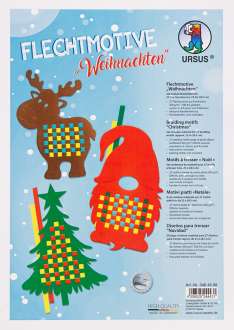 Ursus Flechtmotive "Weihnachten" mit vorbearbeiteten Bogen zum Flechten und Weben, mit 9 unterschiedlichen Motiven in 8 unterschiedlichen Farben, Gewicht: 300 g/m², Grösse: 21 x 29,7 cm (DIN A4). Inhalt: 27 Blatt Motiv-Fotokarton, Anleitung.
