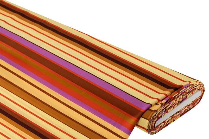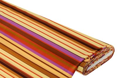 Viskose-Jersey "Streifen", Farbe: rot/gelb/braun, bi-elastisch, Streifen quer verlaufend, Streifenbreite schmaler roter Streifen: 5 mm, Breite: 135 cm, Gewicht: ca. 205 g/m². Material: 92 % Viskose, 8 % Elasthan.