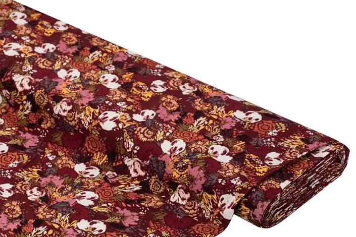 Viskose-Stretch-Popeline "Abstrakte Blumen", Farbe: dunkelrot-color, querelastisch, Breite: 140 cm, Gewicht: ca. 150 g/m². Material: 98 % Viskose, 2 % Elasthan.