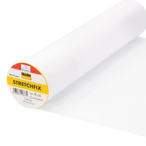 Vlieseline ® Stretchfix, zweiseitig aufbügelbar, elastisches, wärmeaktivierbares Haftmassenweb auf Trägerpapier, Farbe: transparent, Stärke: 0,1 mm, Breite: 30 cm, Länge: 5 m, Gewicht: ca. 20 g/m². Material: 100 % Polyurethan.