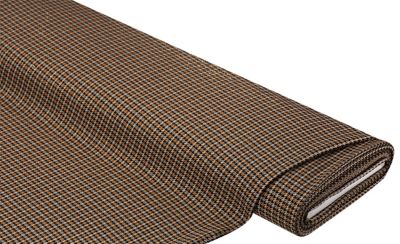 Webstoff "Karo" mit goldenem Glitzerfaden, Farbe: rost/schwarz/beige, Breite: 140 cm, Gewicht: ca. 240 g/m². Material: 67 % Polyester, 28 % Viskose, 3 % Elasthan, 2 % Metallfaser.