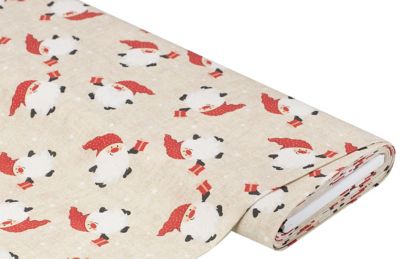 Weihnachtlicher Dekostoff "Wichtel mit Geschenk" aus der Serie Lorena, Farbe: natur/rot, Motivgrösse Wichtel: 8 x 6 cm, Breite: 140 cm, Gewicht: ca. 170 g/m². Material: 50 % Baumwolle, 50 % Polyester.