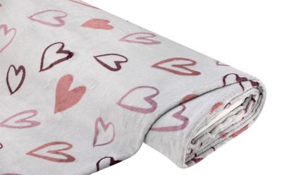 Kuscheliges Wellness-Fleece "Herzen", Farbe: grau/rosa, Motivgrösse: 7-9 cm Ø, Florhöhe: 7 mm, Breite: 150 cm, Gewicht: ca. 260 g/m². Material: 100 % Polyester.