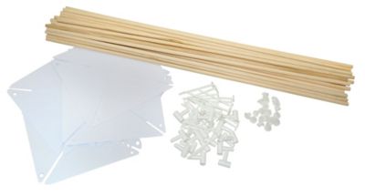 Windrad-Bastelset zum Basteln von 20 Windrädern, Inhalt: 20 Holzstäbe natur, Länge: 50 cm, 20 Zuschnitte aus dickerem Papier, weiss, Grösse: 14,5 x 14,5 cm, Verbindungsstücke aus Kunststoff und eine bebilderte Anleitung.