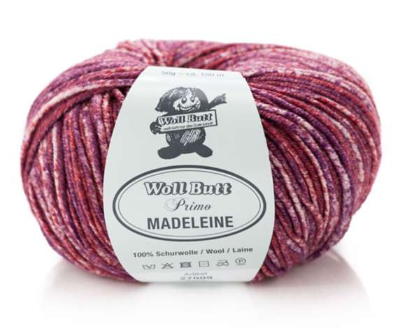 Woll Butt Primo Madeleine, beere color. Wunderschönes, weiches und feines Garn aus hochwertiger Wolle des Merino-Schafes für höchste Ansprüche. Das voluminöse Garn ist angenehm auf der Haut und bestens geeignet für Pullover, Jacken, Kindermodelle uvm. Durch das klare Maschenbild kommen Muster besonders gut zur Geltung.