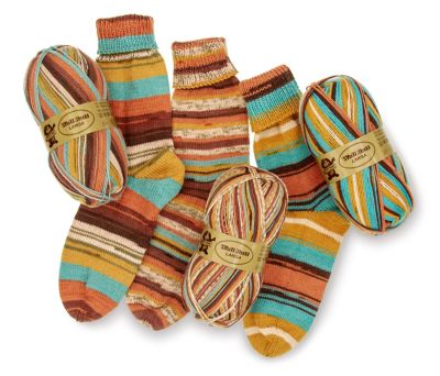 Dieses Sparpaket enthält Wolle für 3 Paar Socken in Ocker color mit verschiedenen Designs.
